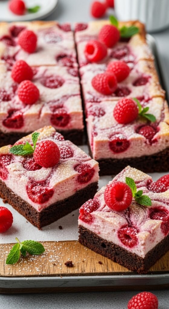 - In another bowl, blend cream cheese with sugar; layer brownies with raspberries on top and bake for 30-35 minutes.
