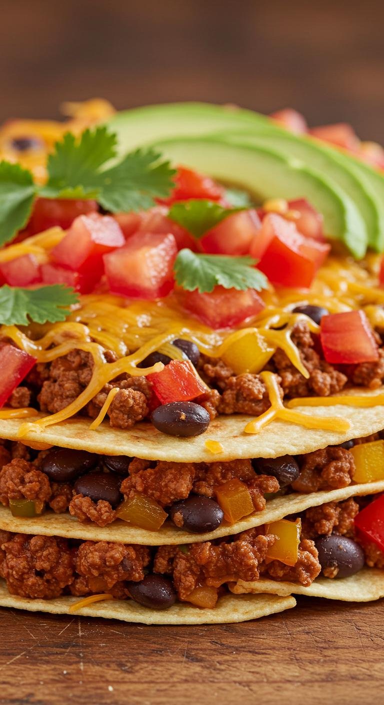 - Layer tortillas with beef mixture and cheese in between.