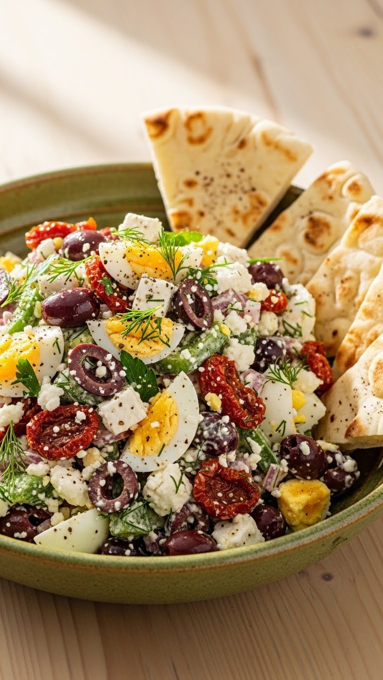 - In a bowl, combine chopped eggs, Greek yogurt, feta, olives, and sun-dried tomatoes.