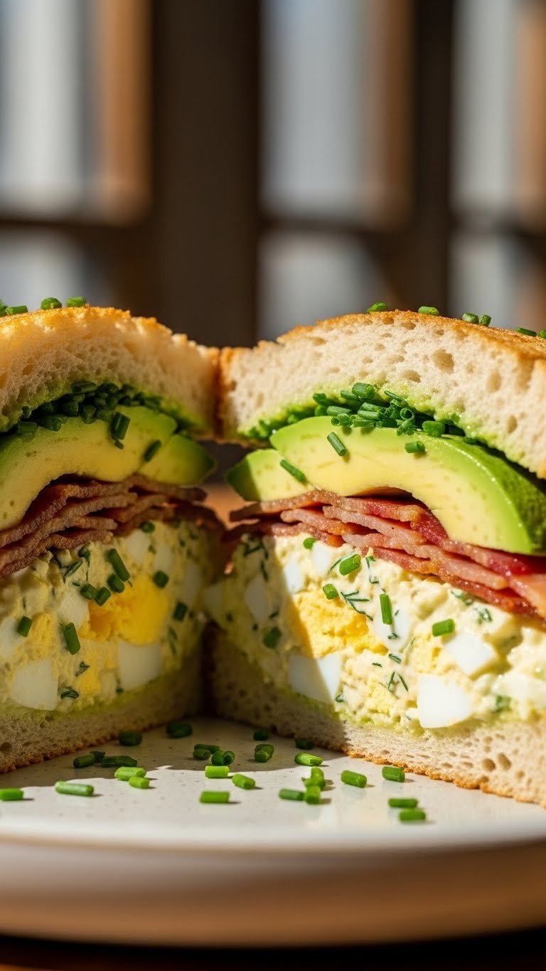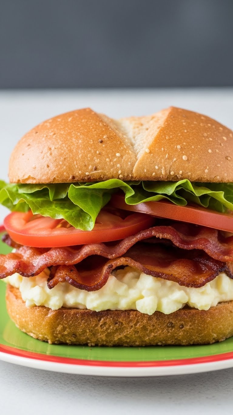 - Layer bacon, lettuce, tomato, and egg salad on toasted bread.