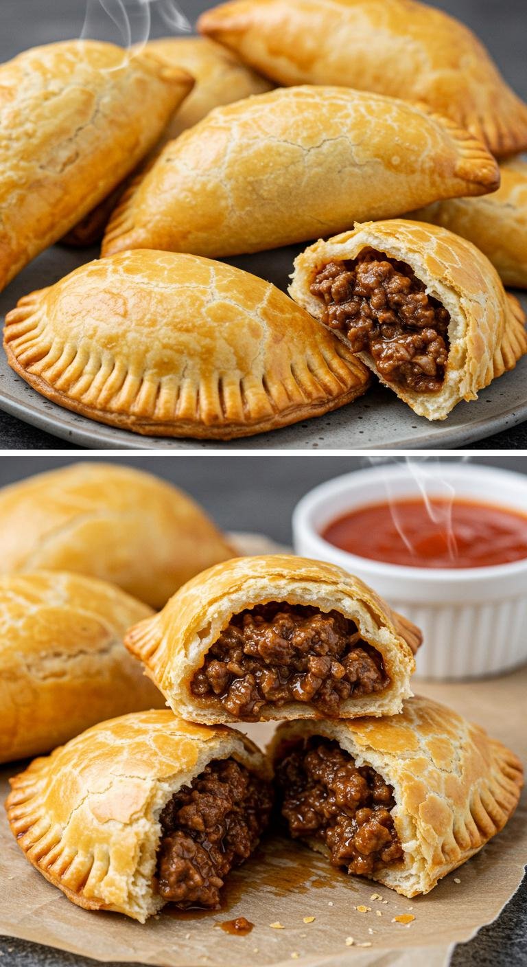 - Roll out dough, cut into circles, fill with beef mixture, fold, and seal edges. Bake at 375°F for 20-25 minutes.