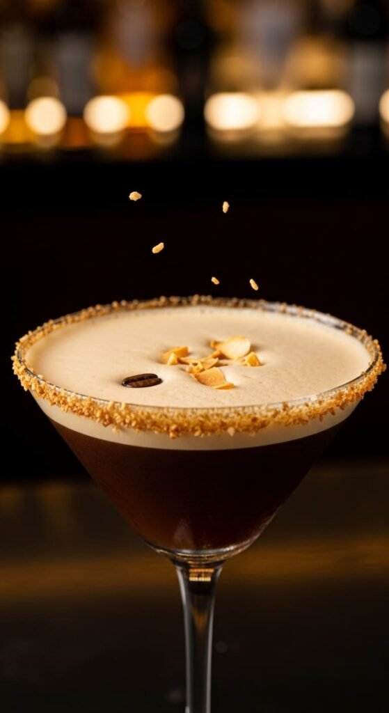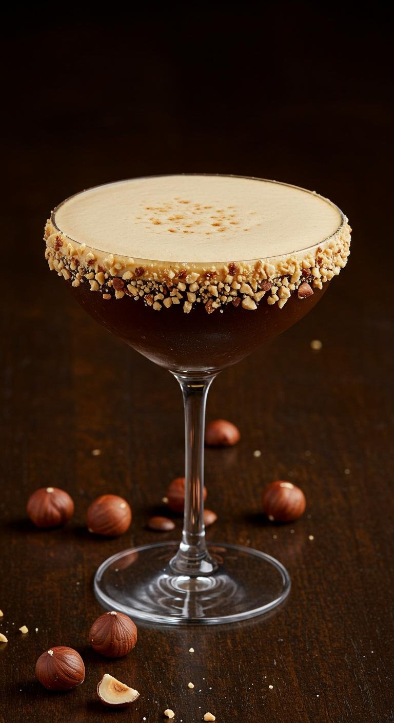 - Shake vodka, hazelnut liqueur, and espresso with ice.
