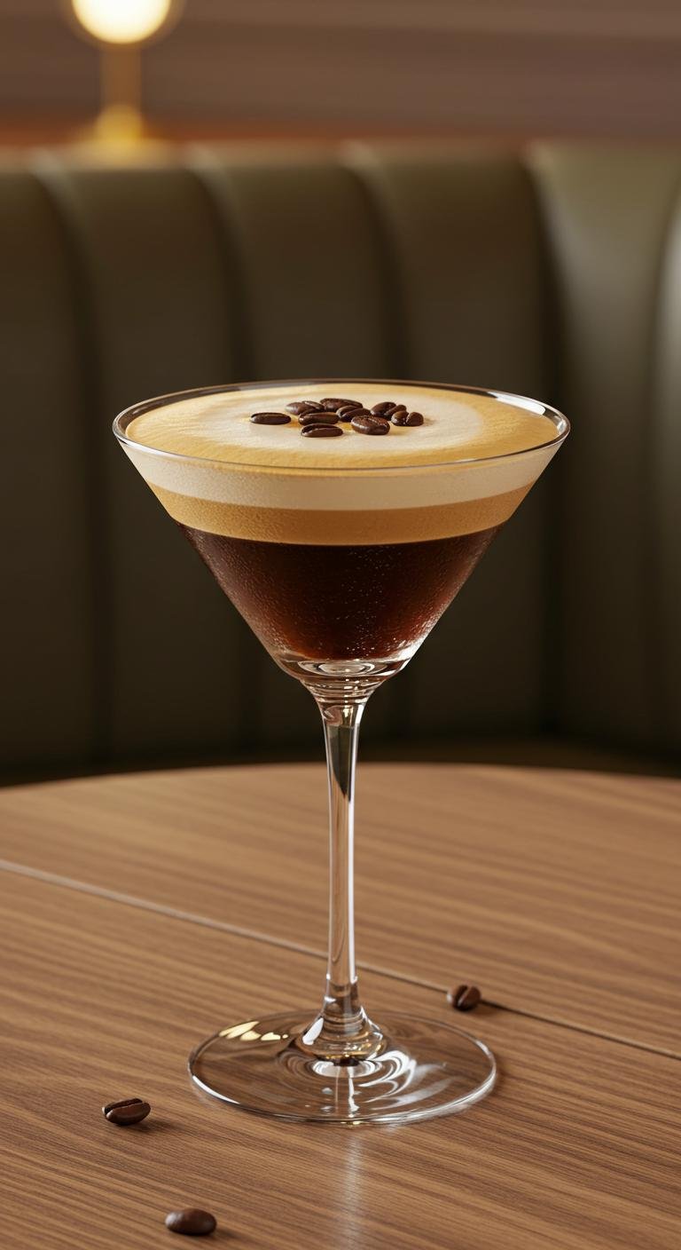 - Shake vodka, vanilla liqueur, and espresso with ice.