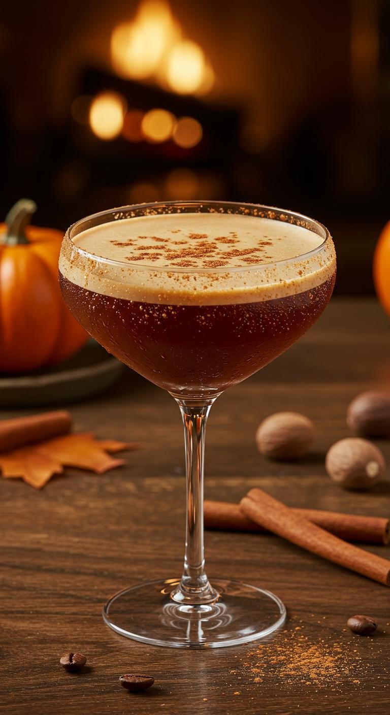 - Shake vodka, pumpkin spice liqueur, and espresso; strain into a glass.