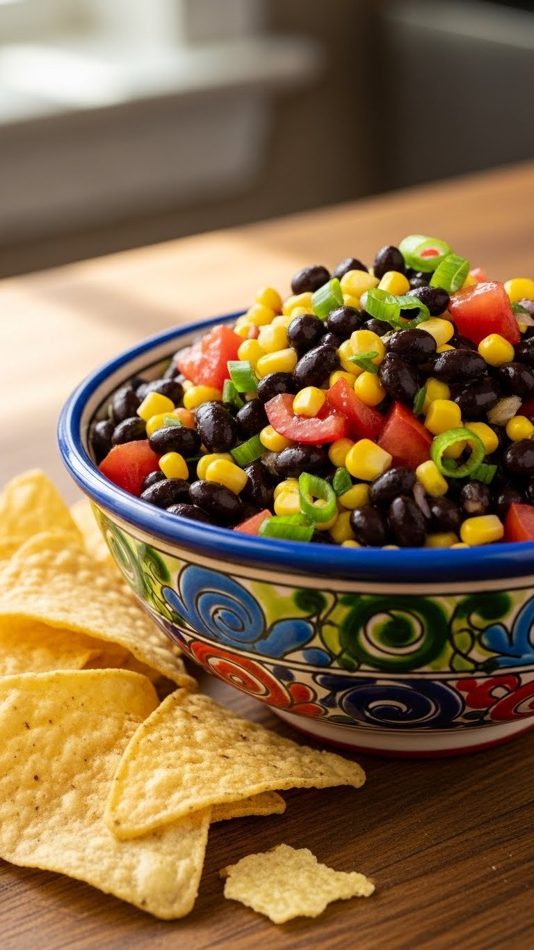 - In a mixing bowl, combine the black beans, corn, tomatoes, and onion.