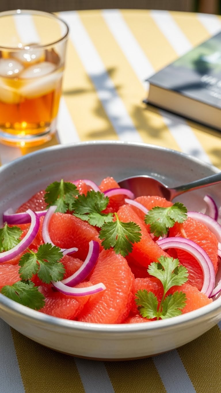 - In a bowl, combine grapefruit, onion, and cilantro.