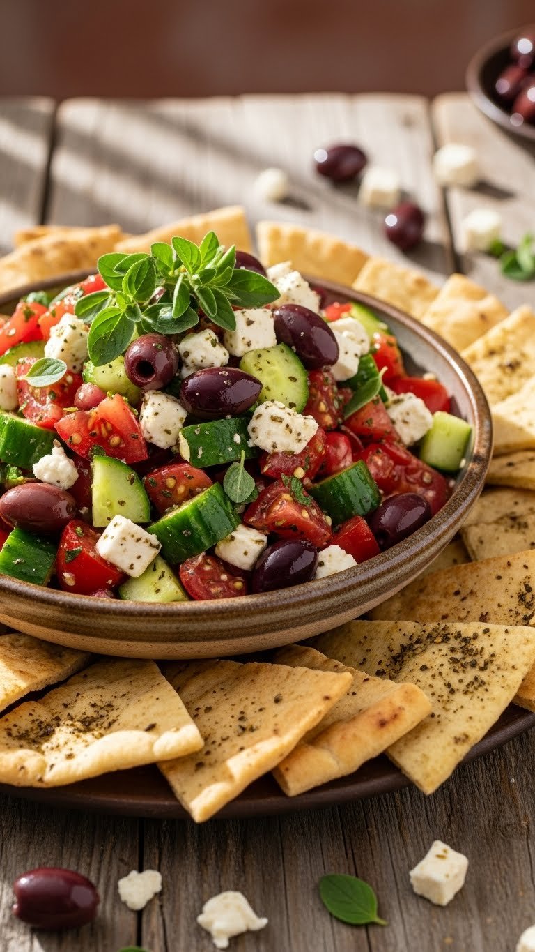 - Combine tomatoes, cucumber, olives, and feta in a bowl.