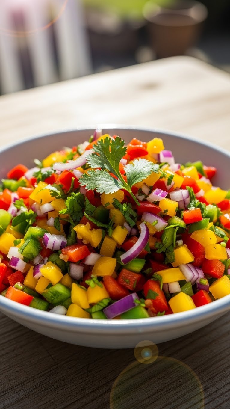- In a bowl, combine bell peppers, onion, and cilantro.