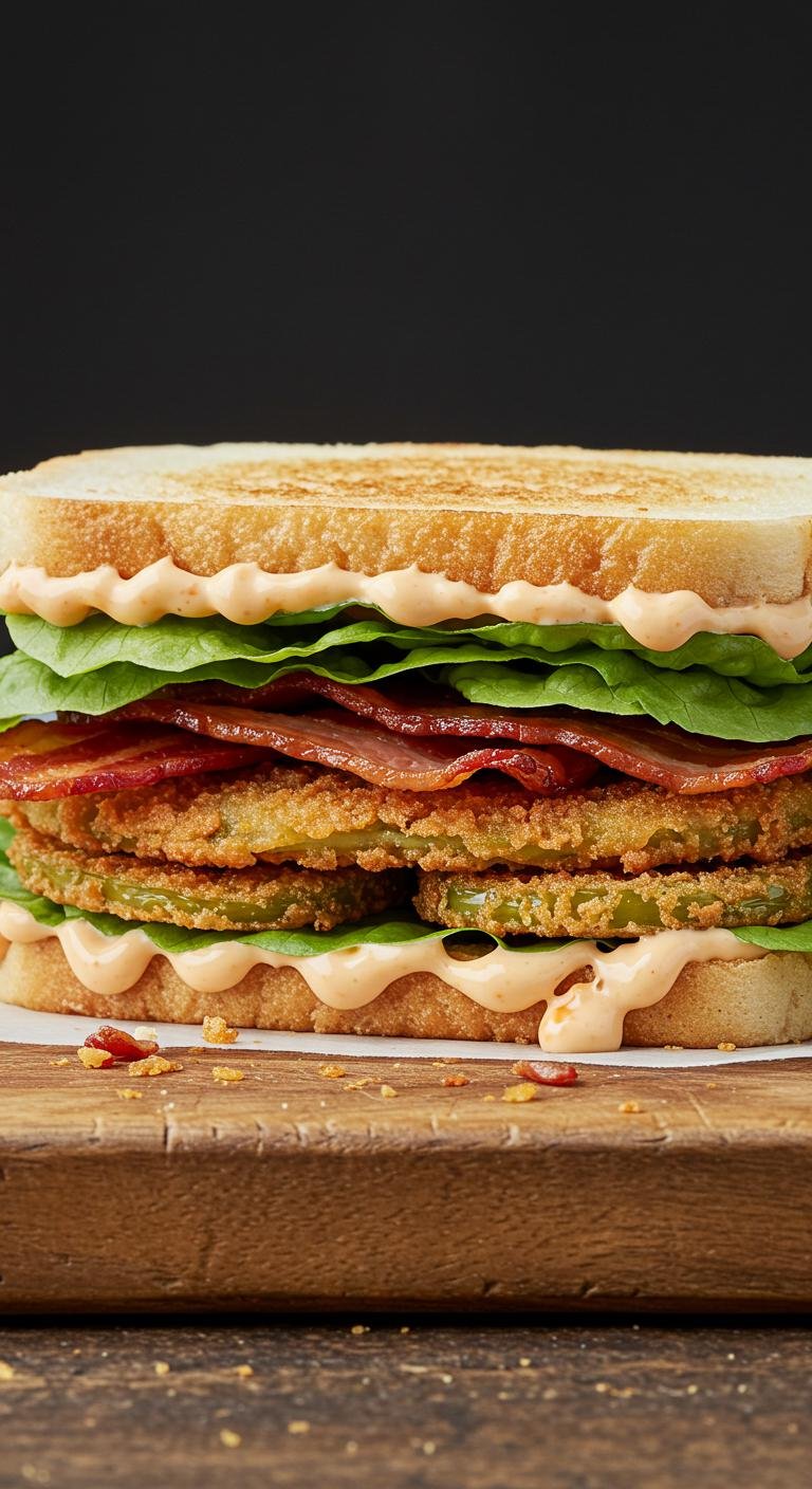 - Layer the fried green tomatoes on bread, top with bacon and lettuce, and smear with spicy mayo.