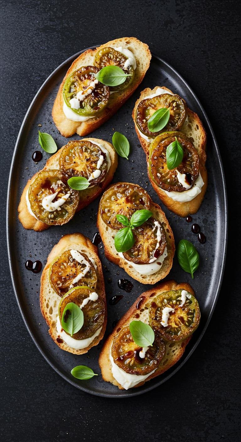 - Top each piece with fried green tomatoes, mozzarella, and a dollop of pesto.