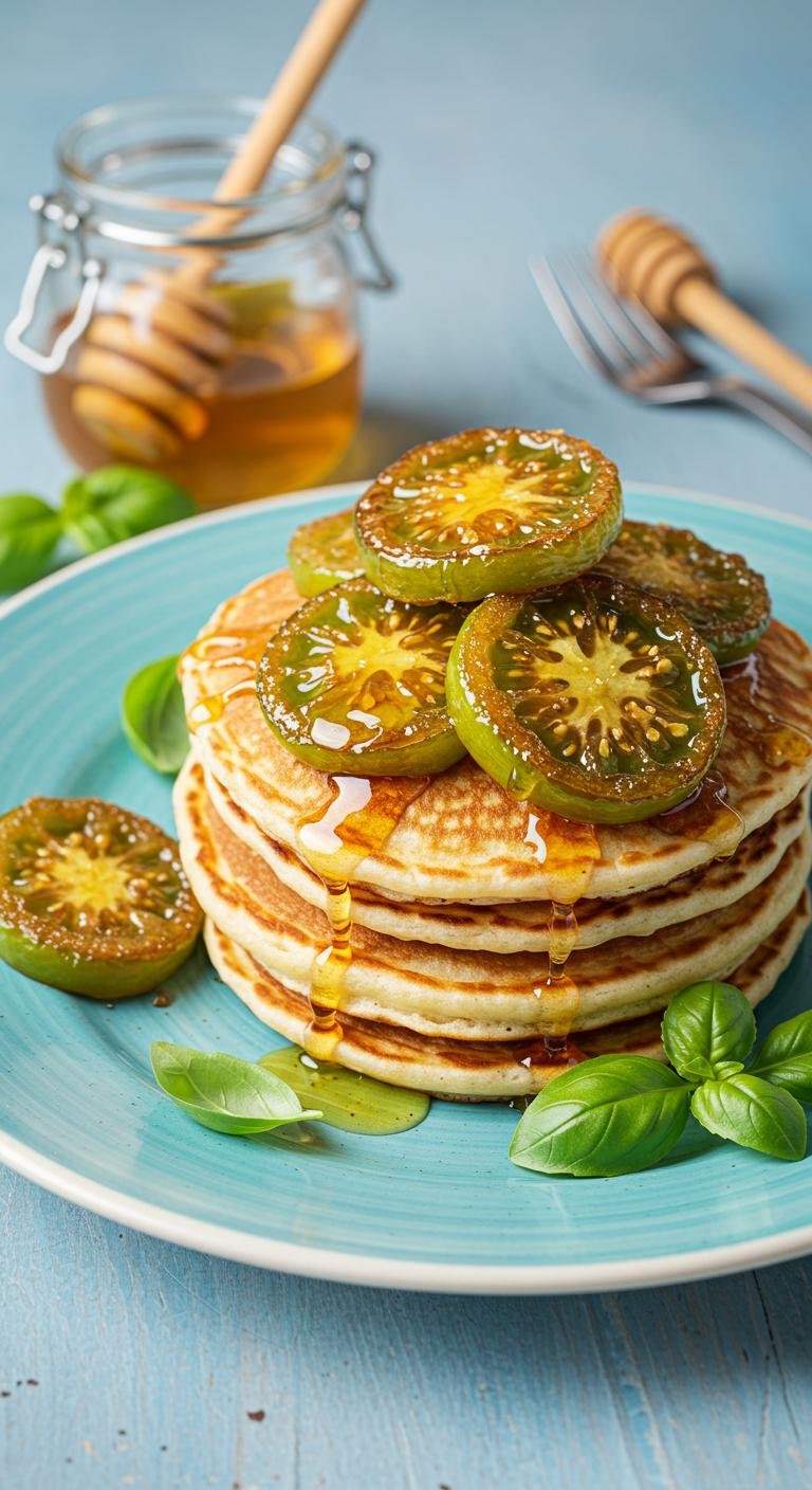 - Prepare pancake batter according to the mix instructions. Fold in fried green tomatoes.