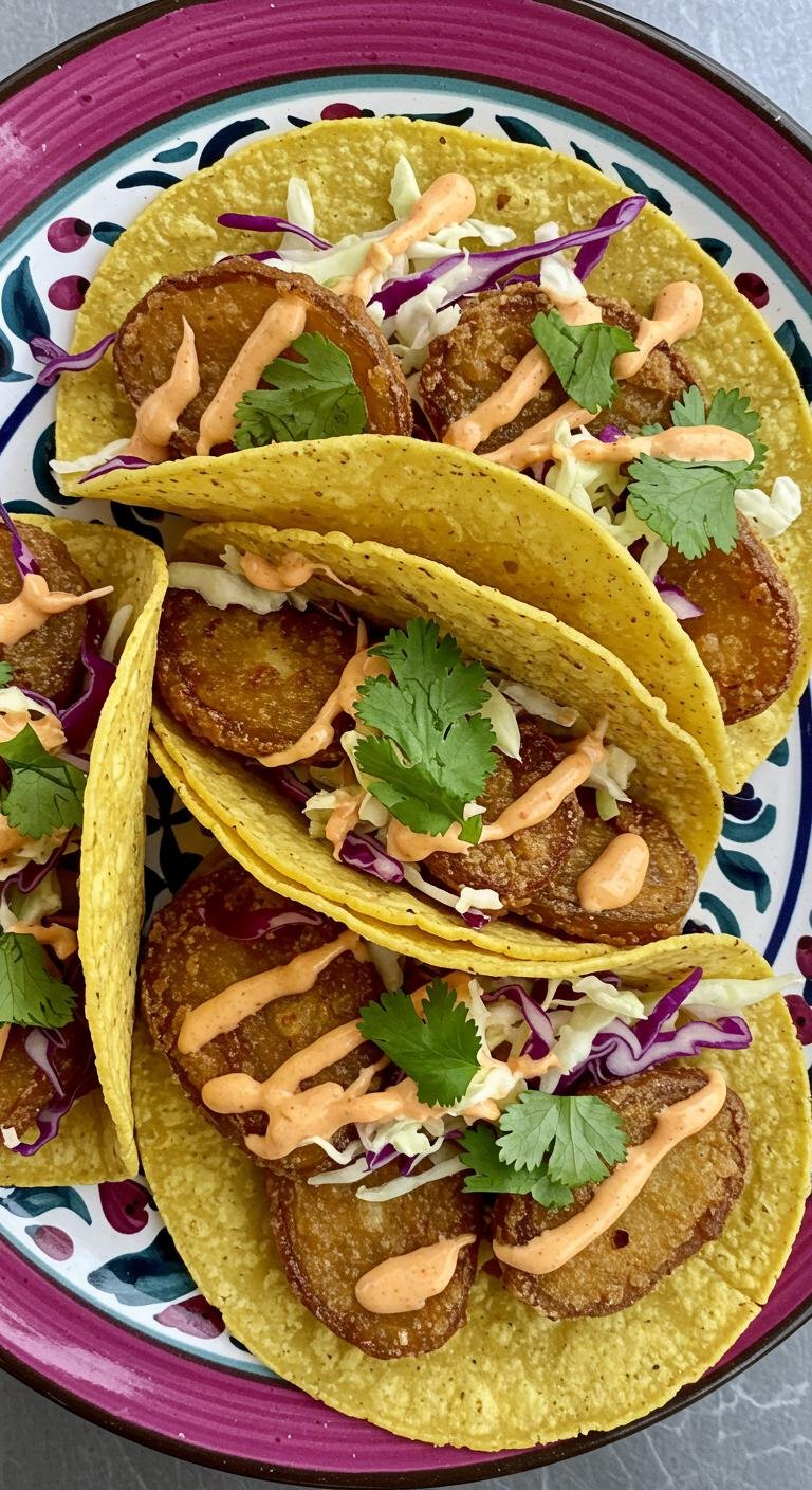 - Fill each tortilla with fried green tomatoes and cabbage, drizzling with cilantro lime sauce.