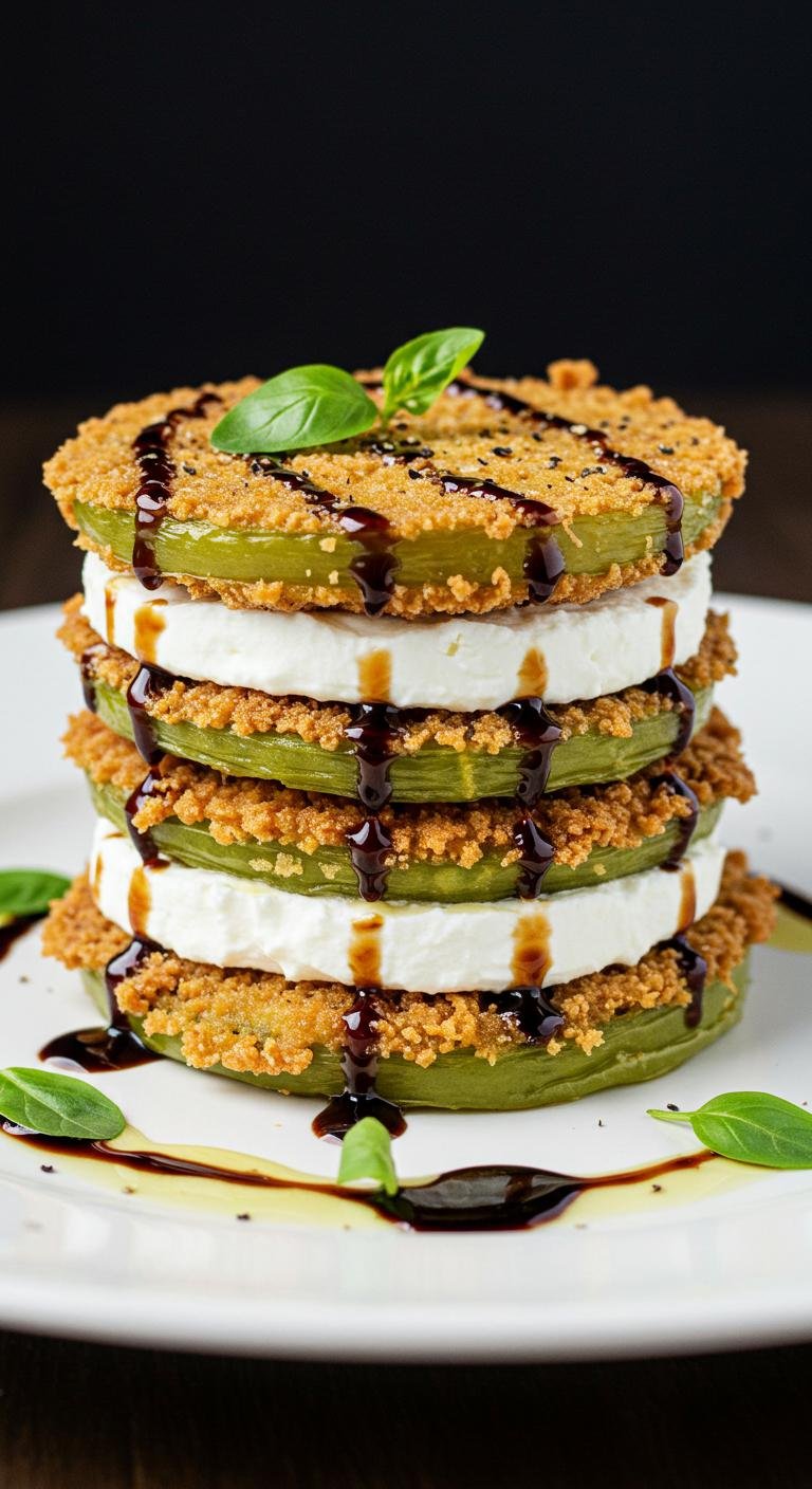 - Layer each fried green tomato with goat cheese and basil leaves, forming a stack.