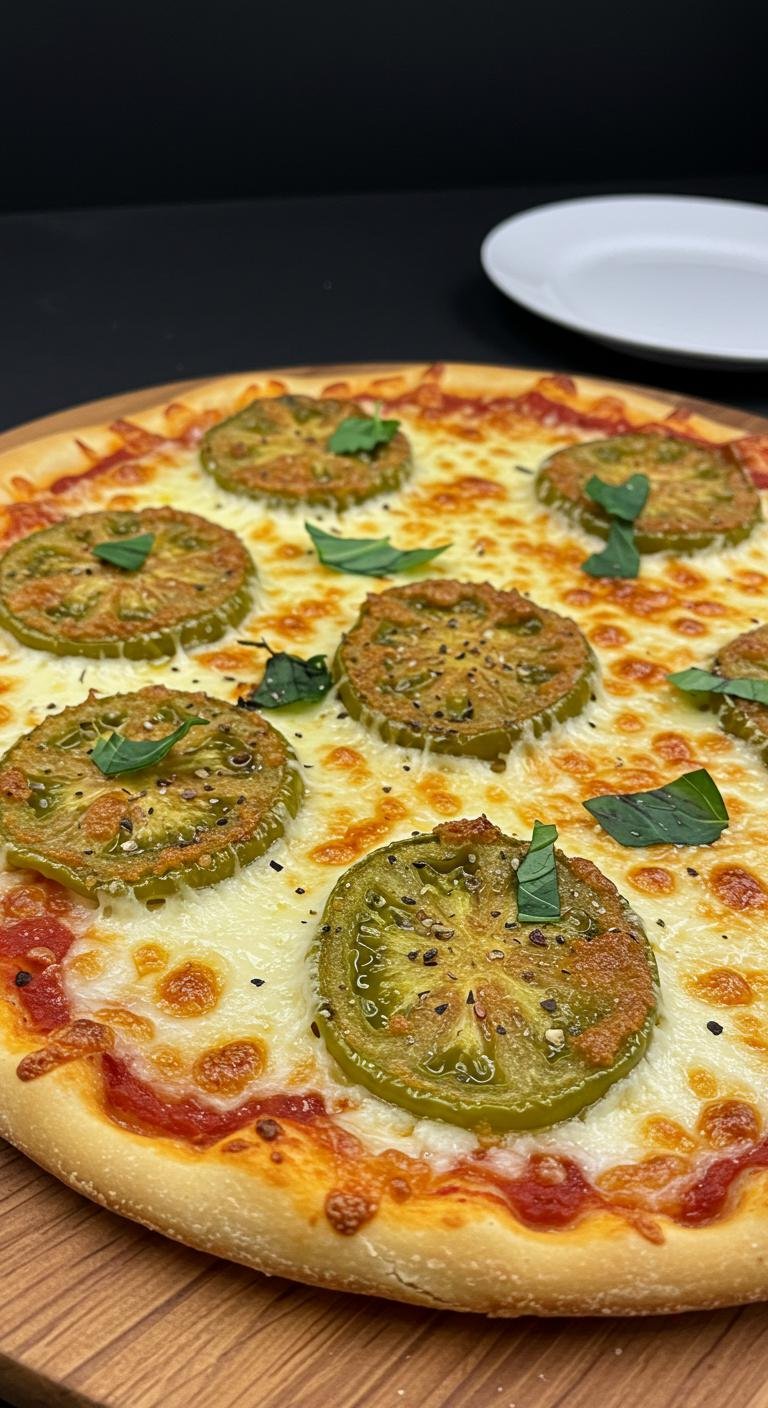 - Spread marinara sauce over the crust, then add cheese and fried green tomatoes.