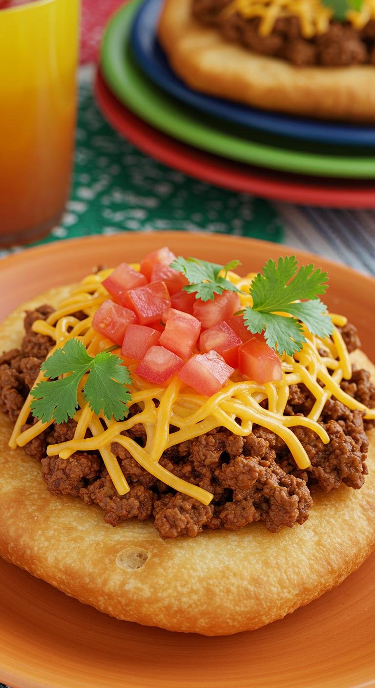 - Fry the bread and top with cooked, seasoned ground beef, cheese, and toppings of choice.