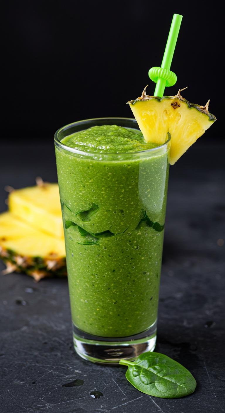 - Blend pineapple, banana, spinach, and coconut milk until smooth.