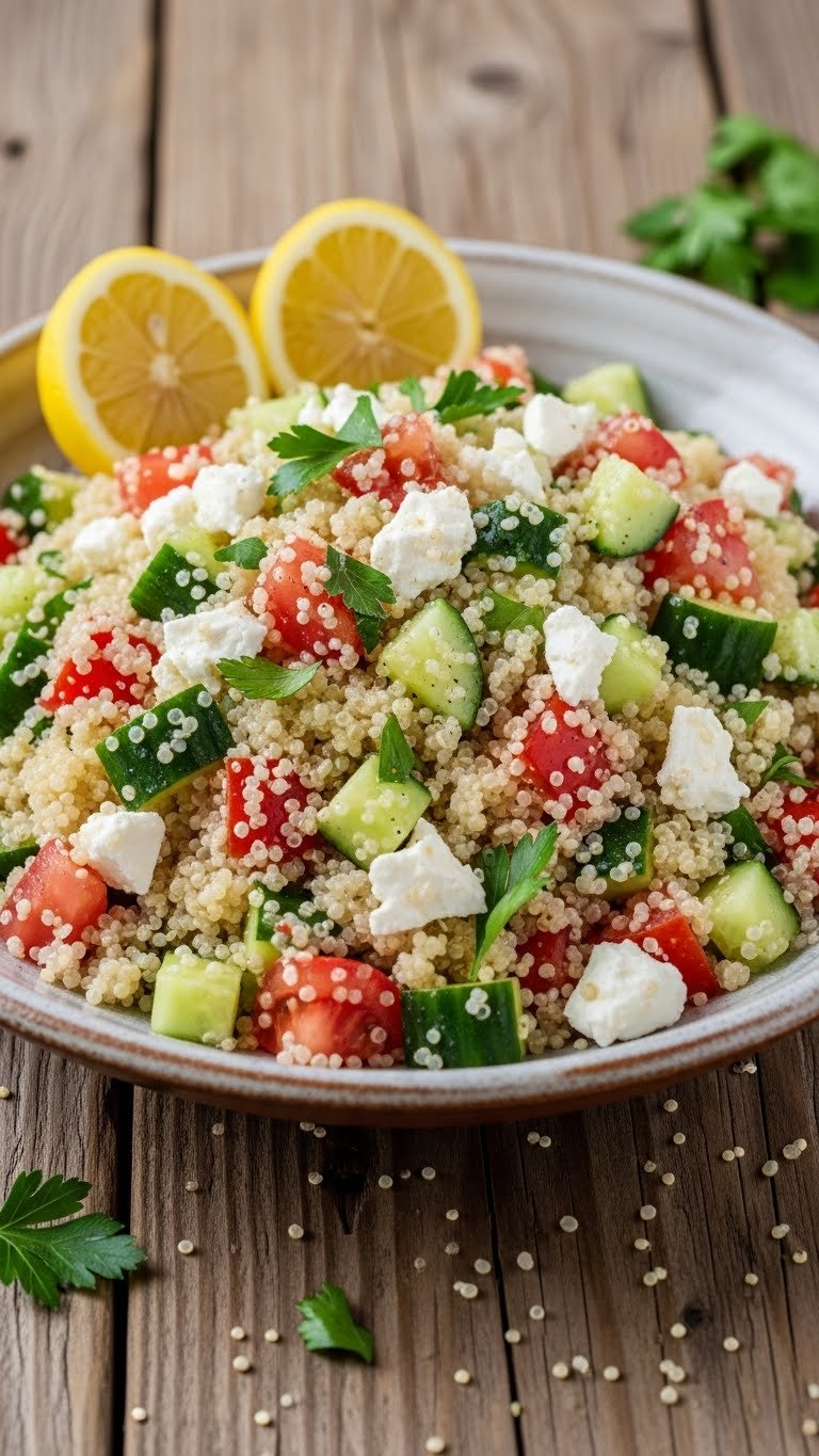 - In a bowl, mix quinoa, tomatoes, cucumber, parsley, and feta.