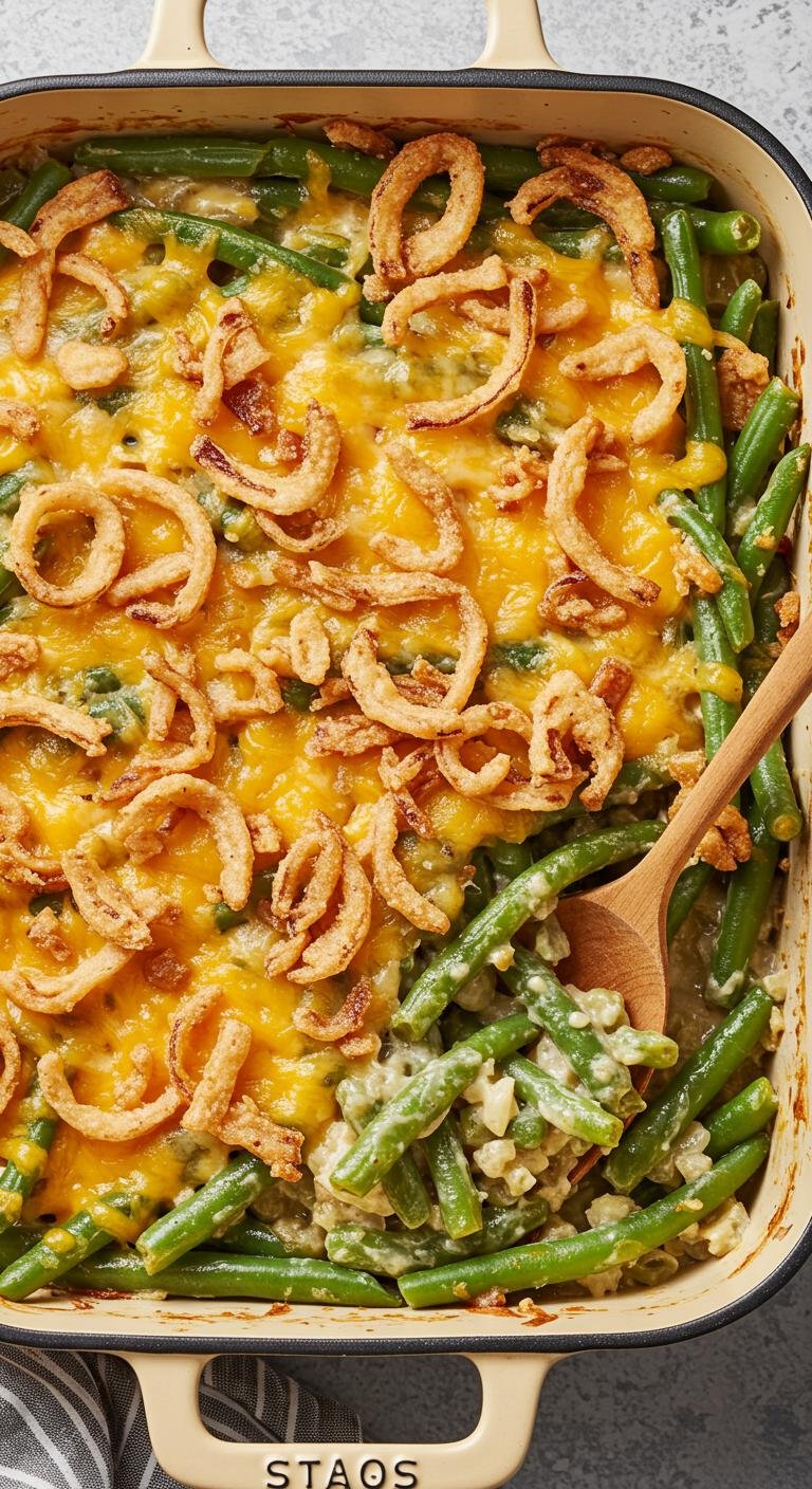 - Preheat the oven to 350°F (175°C). In a bowl, mix green beans, soup, and half of the cheese.
