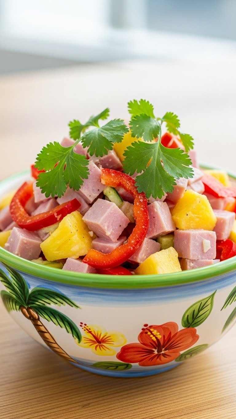 - Mix ham, pineapple, and bell pepper in a bowl.
