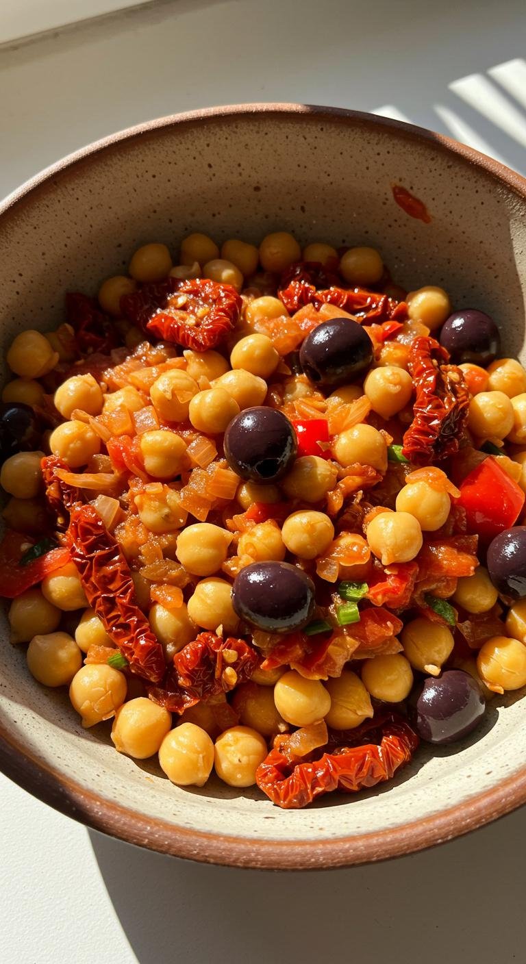 - In a pot, combine chickpeas, diced tomatoes, sun-dried tomatoes, olives, and oregano.