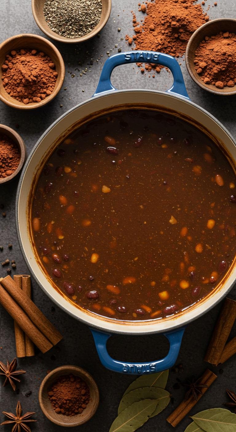 - Add tomatoes, cocoa, beans, and chili powder. Simmer for 20 minutes.