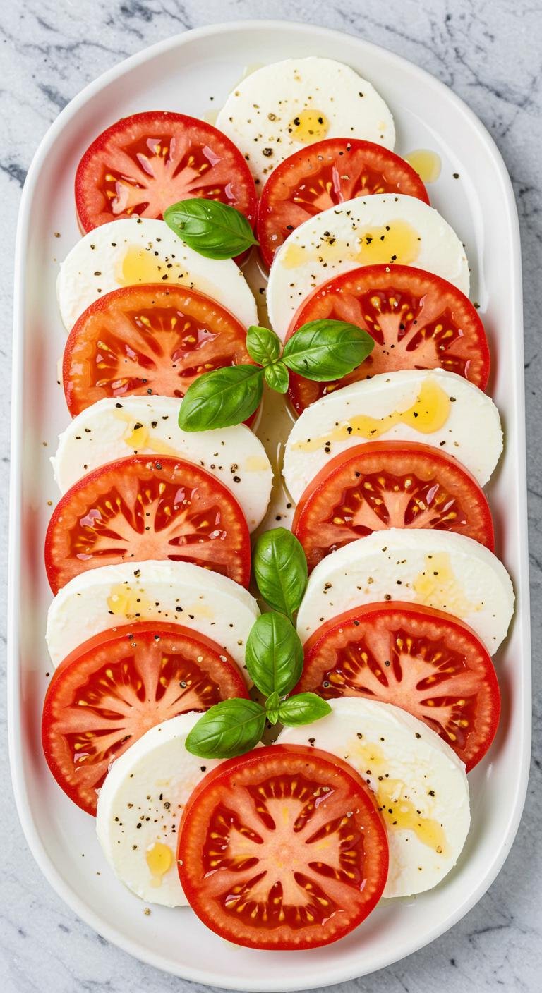 - Layer tomato and mozzarella slices on a platter, interspersing with basil leaves.