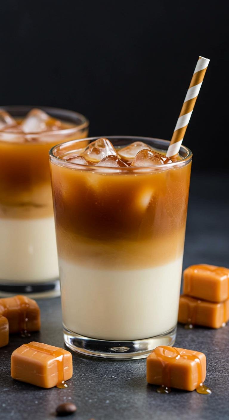 - Mix chilled coffee, milk, and caramel sauce in a glass filled with ice.