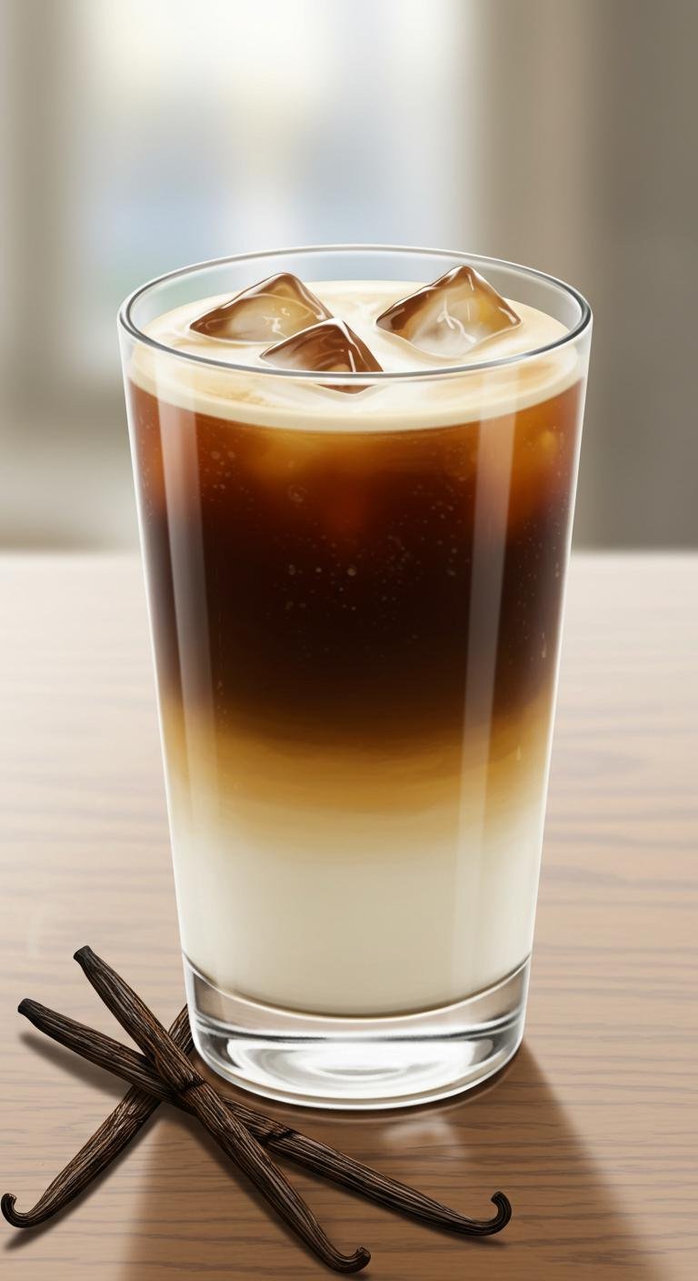 - Pour in chilled espresso, followed by milk and vanilla syrup. Stir well.