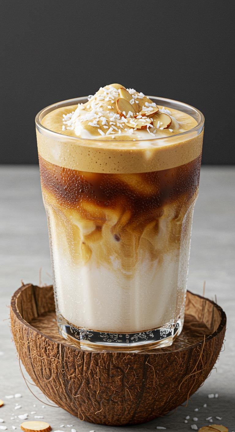- Mix chilled coffee with almond milk and coconut syrup over ice in a glass.