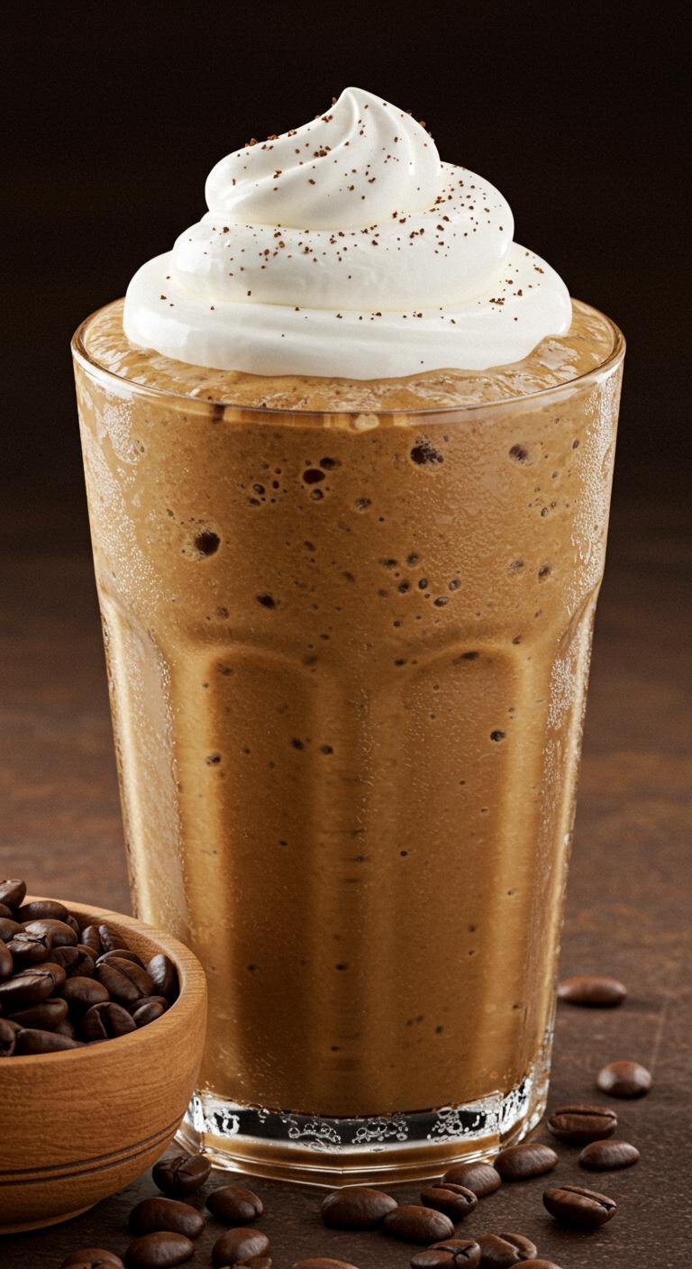 - Blend chilled coffee, banana, milk, and ice until smooth.
