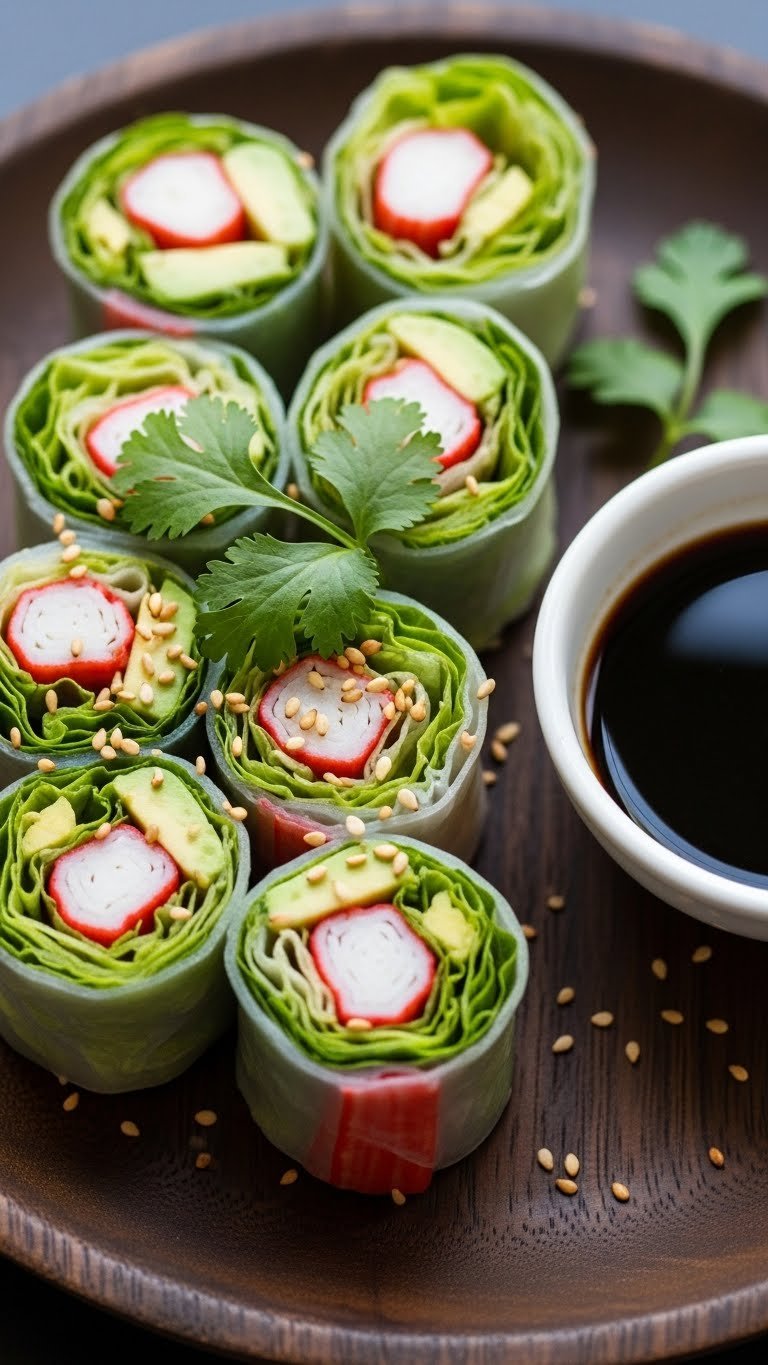 - Layer crab meat, avocado, and lettuce on the sheet, then roll tightly.
