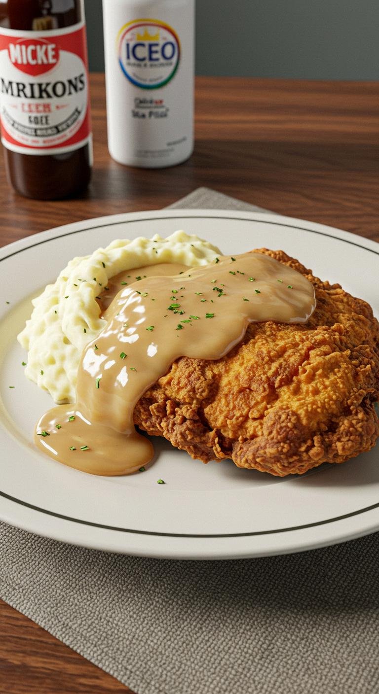 - In the same skillet, make gravy with butter, flour, and chicken broth.