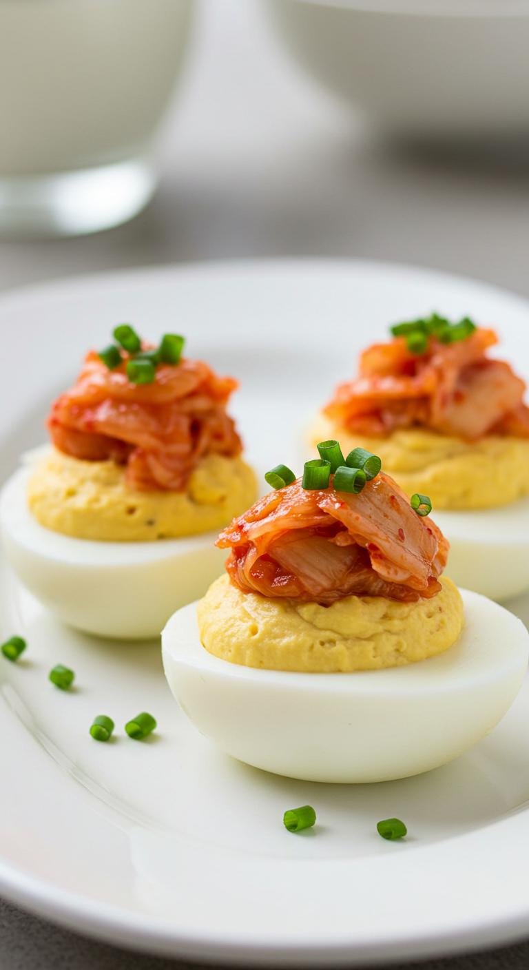 - Fill egg halves with the mixture and garnish with additional kimchi.