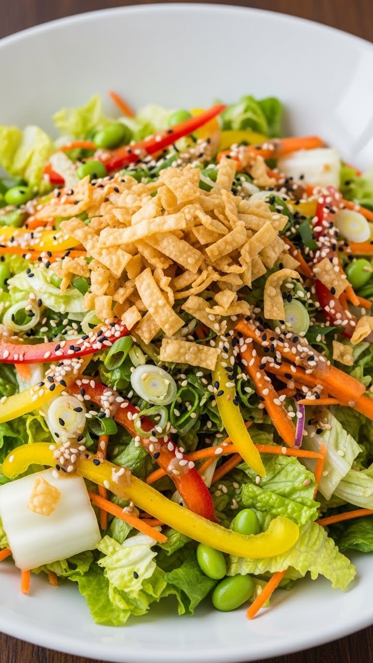 - Drizzle with sesame-ginger dressing and toss. Top with wonton strips.