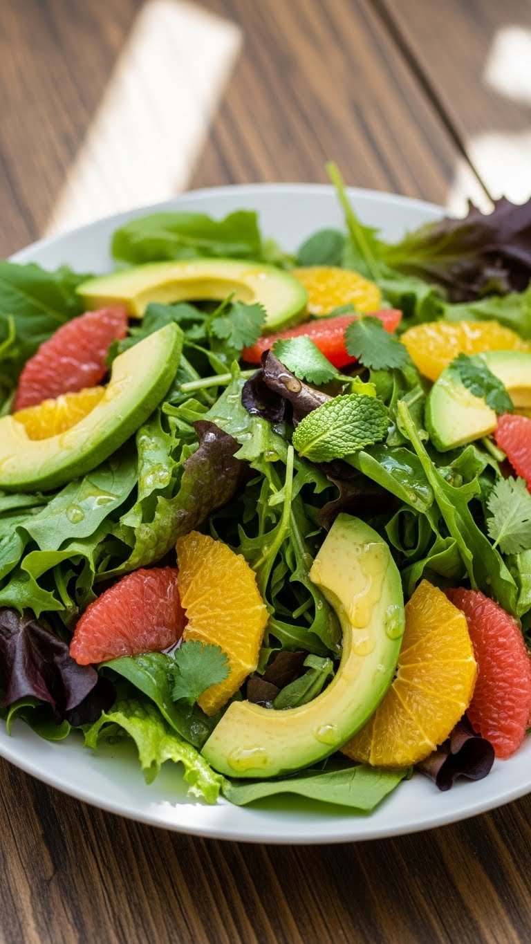 - In a bowl, layer baby greens, avocado, and citrus segments.
