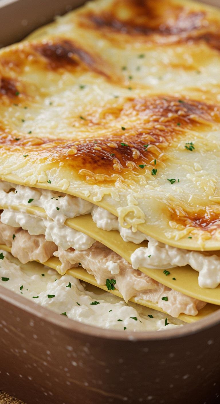 - In a baking dish, layer noodles, cottage cheese, chicken, and white sauce.