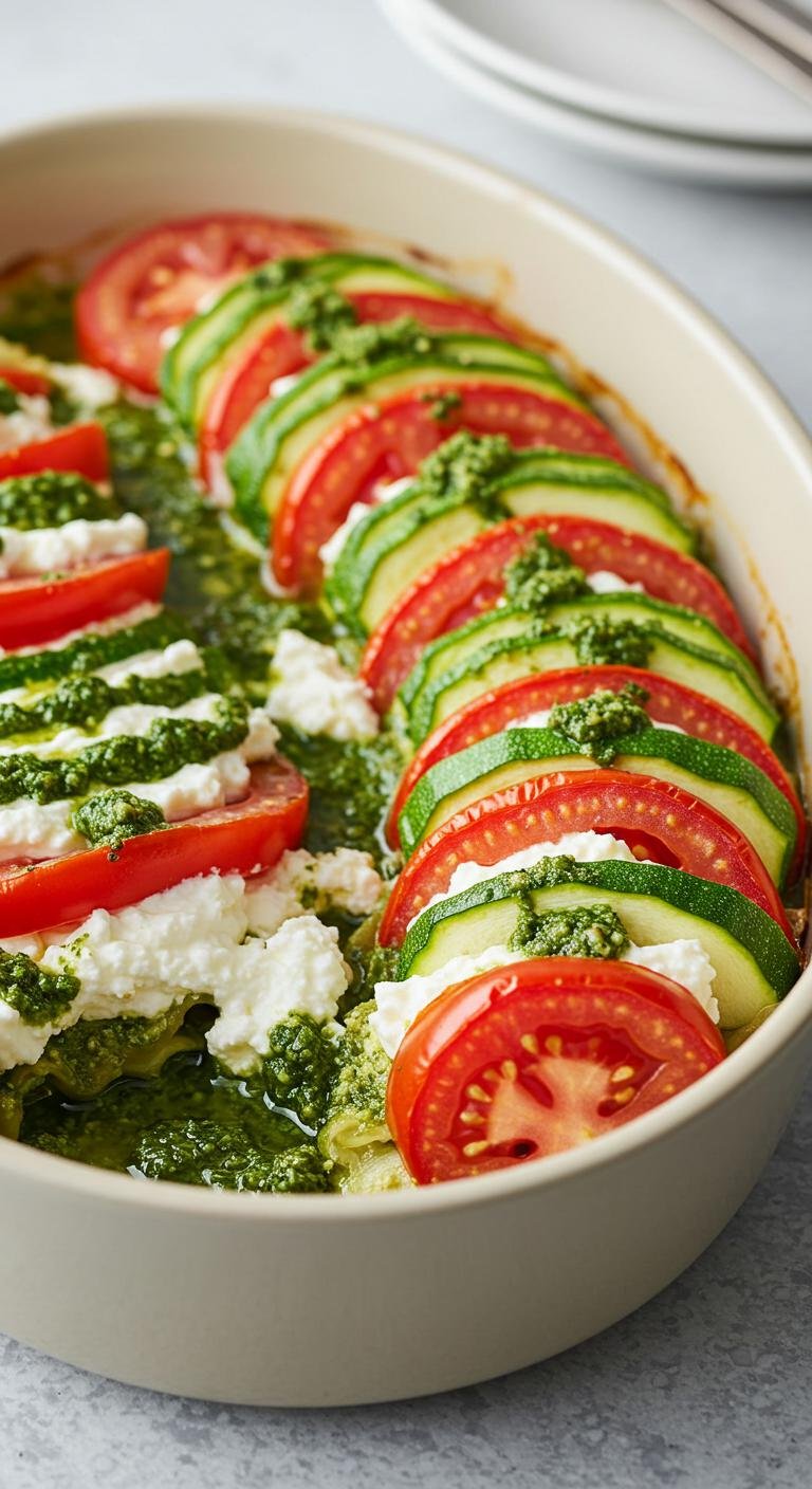 - In a bowl, combine cottage cheese and veggies. Layer noodles, veggie mix, and pesto in a baking dish.