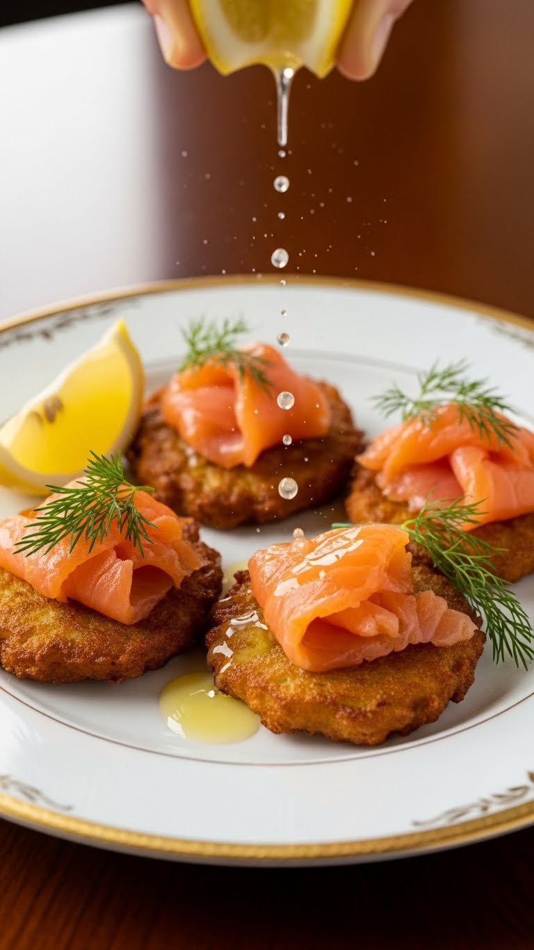 - Top each latke with a slice of smoked salmon and a sprinkle of dill.
