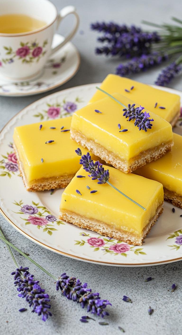 - Preheat the oven to 350°F (175°C). Cream butter, flour, powdered sugar, and lavender to form crust. Press into a greased pan.