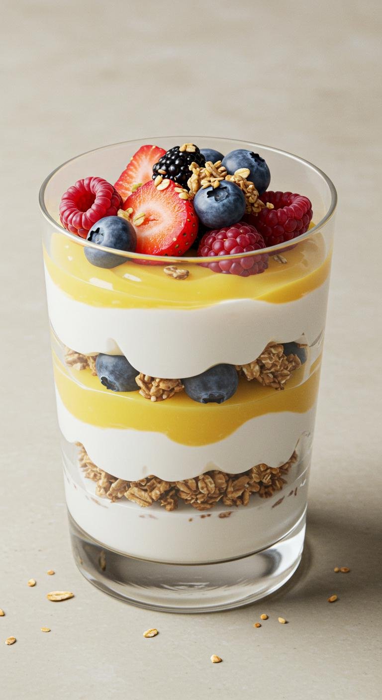 - In a glass, layer Greek yogurt, lemon curd, and granola.