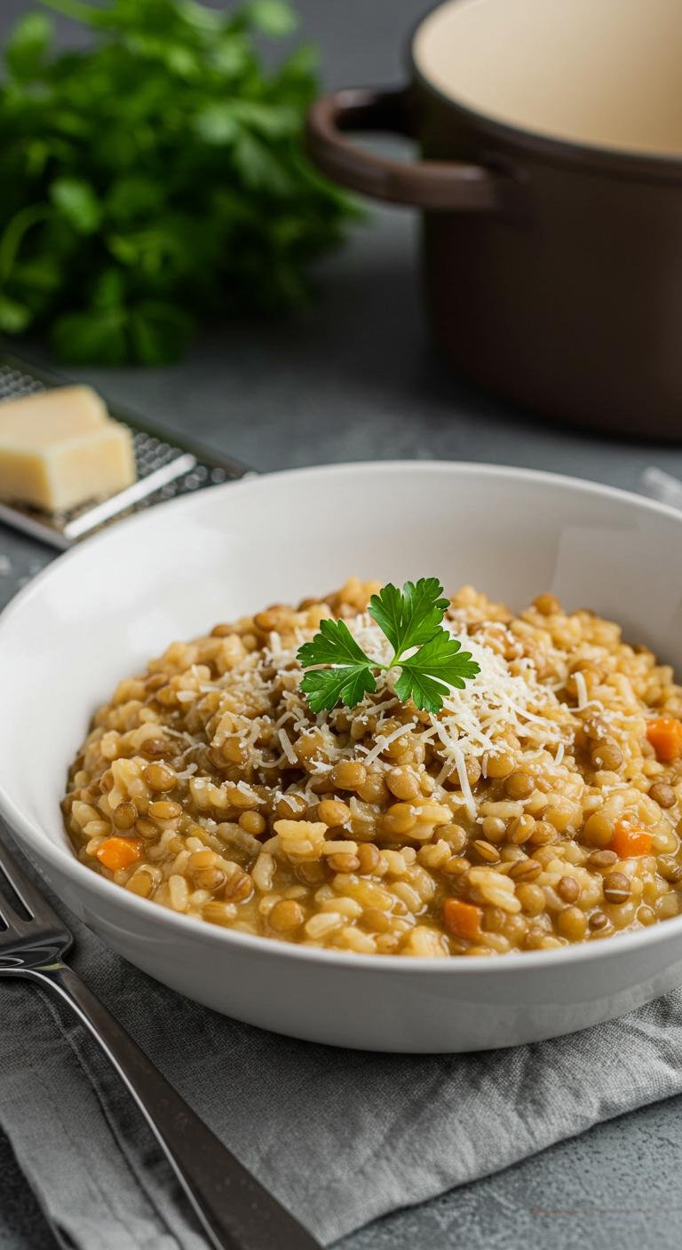 - Add the arborio rice and lentils, stirring for a few minutes before adding broth gradually.