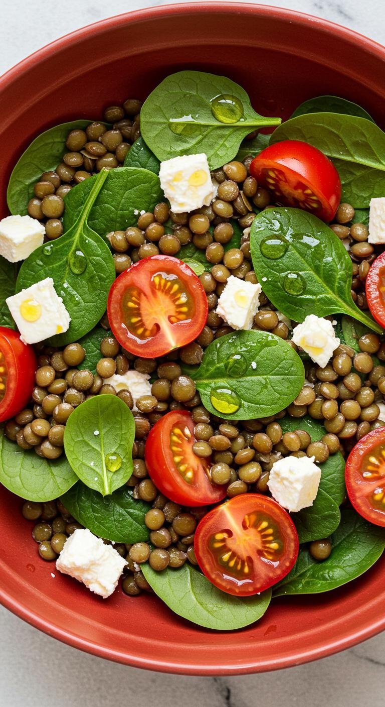 - In a large bowl, combine lentils, spinach, feta, and tomatoes.