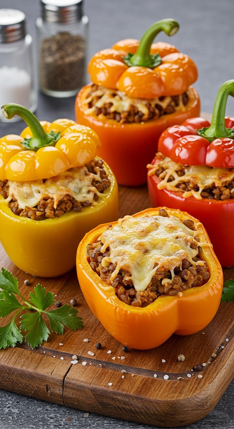 - Stuff bell peppers with the mixture and top with cheese; bake for 25 minutes.