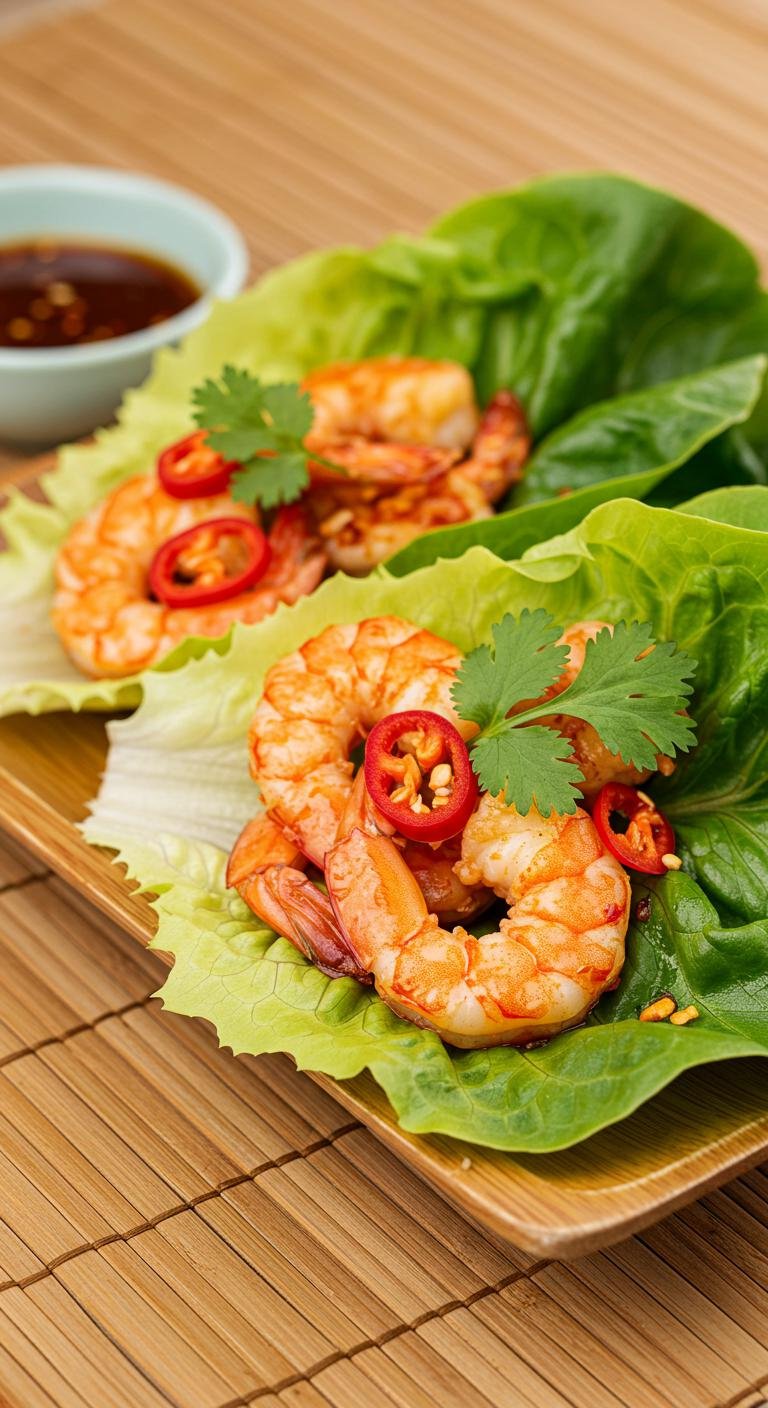 - Arrange shrimp in lettuce leaves topped with red bell pepper and cucumber.
