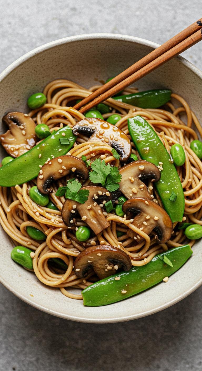 - In a pan, heat sesame oil and add mushrooms and snap peas, sautéing until tender.