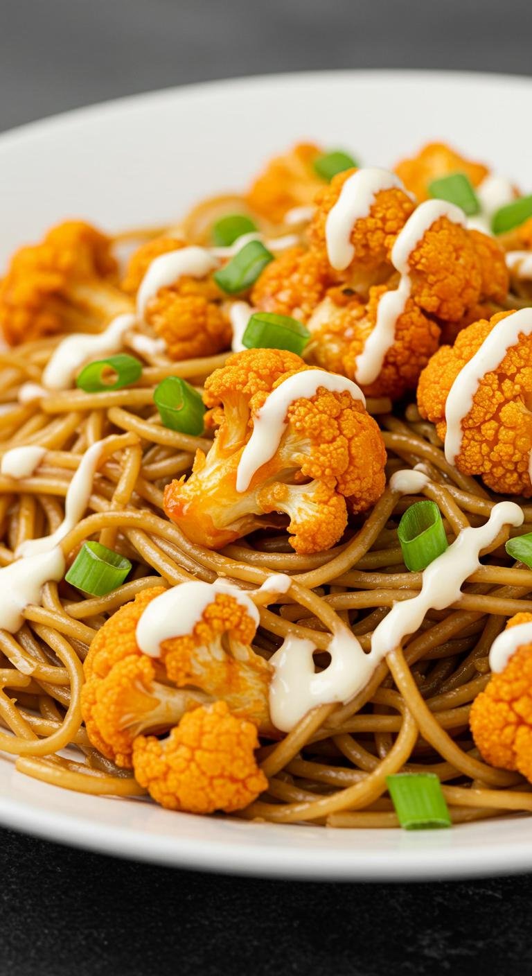 - Combine noodles and cauliflower; drizzle ranch dressing and top with green onions.