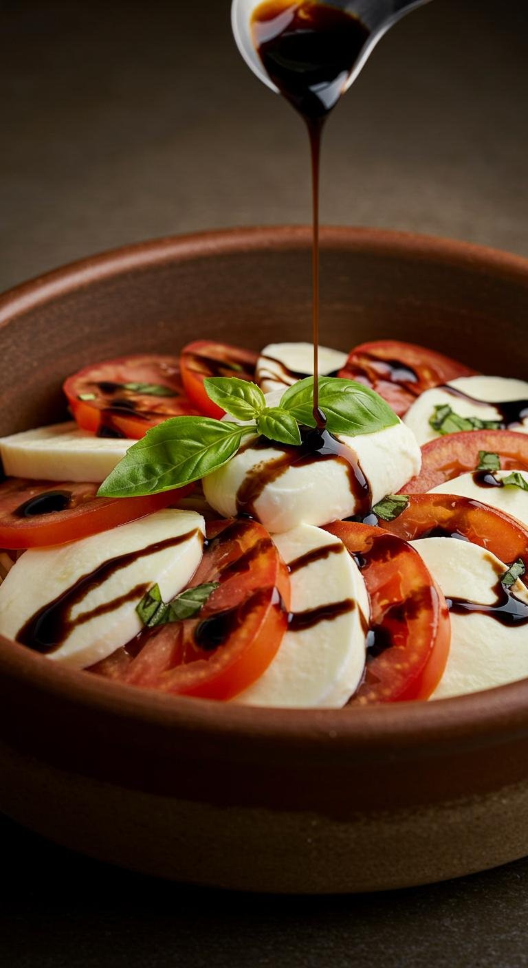 - Drizzle with balsamic reduction and sprinkle with basil.