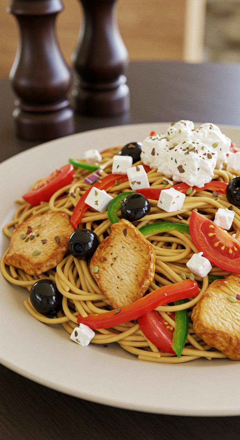 - Sauté mixed veggies in olive oil until just soft, then stir in cooked noodles.