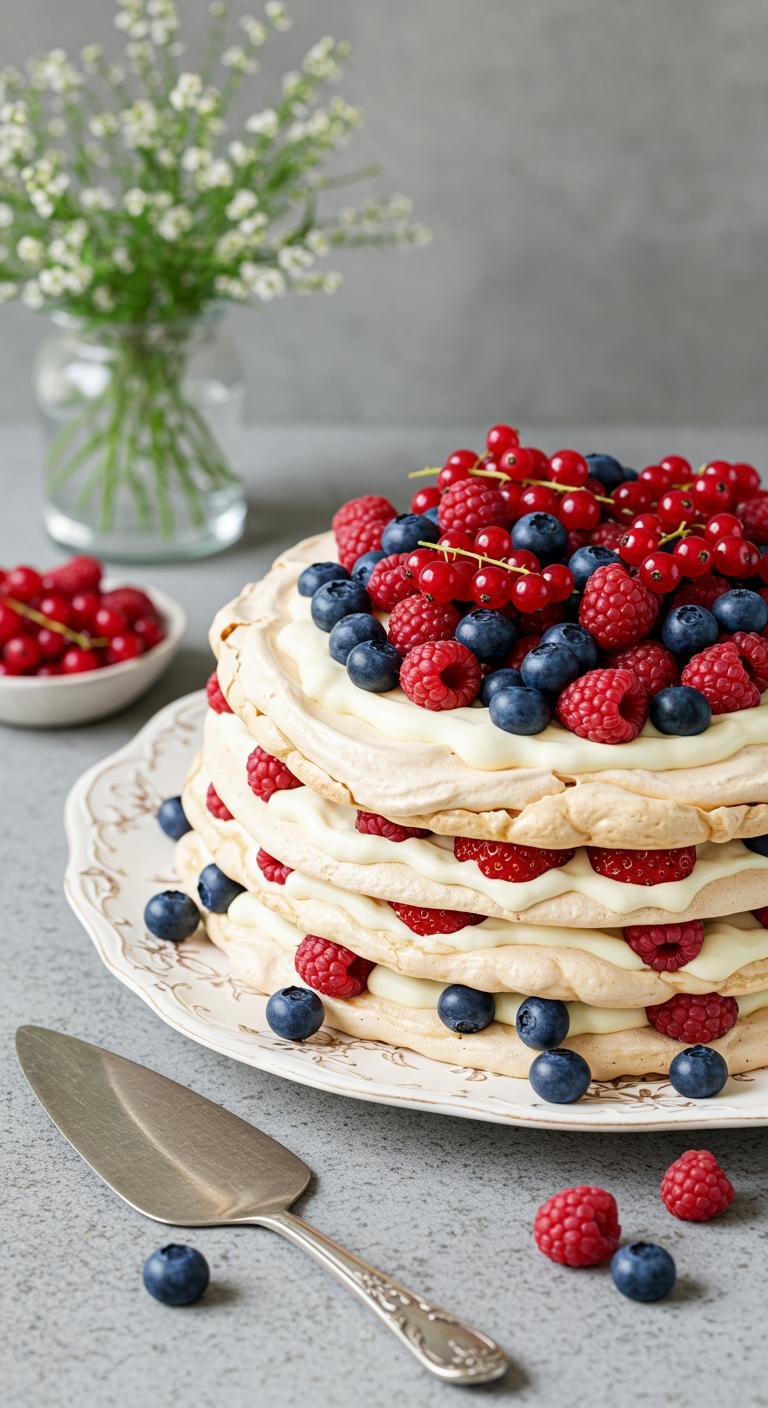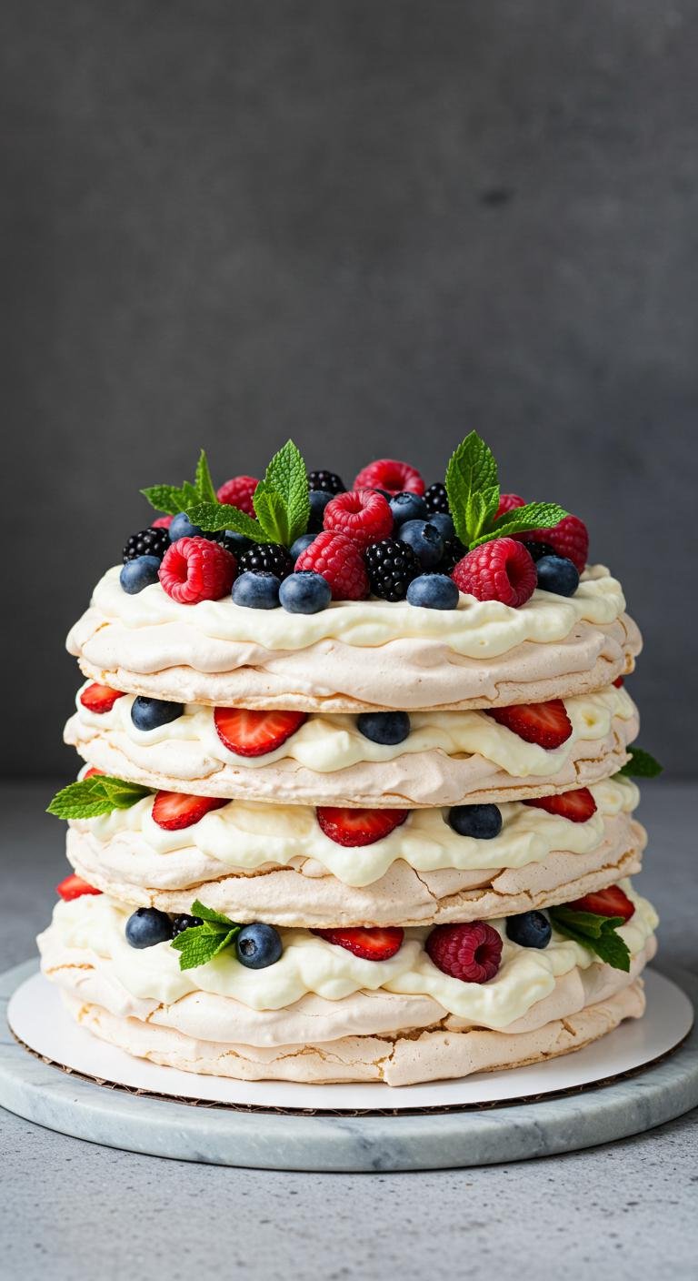 - Whip cream until soft peaks form and layer between meringues. Top with berries.