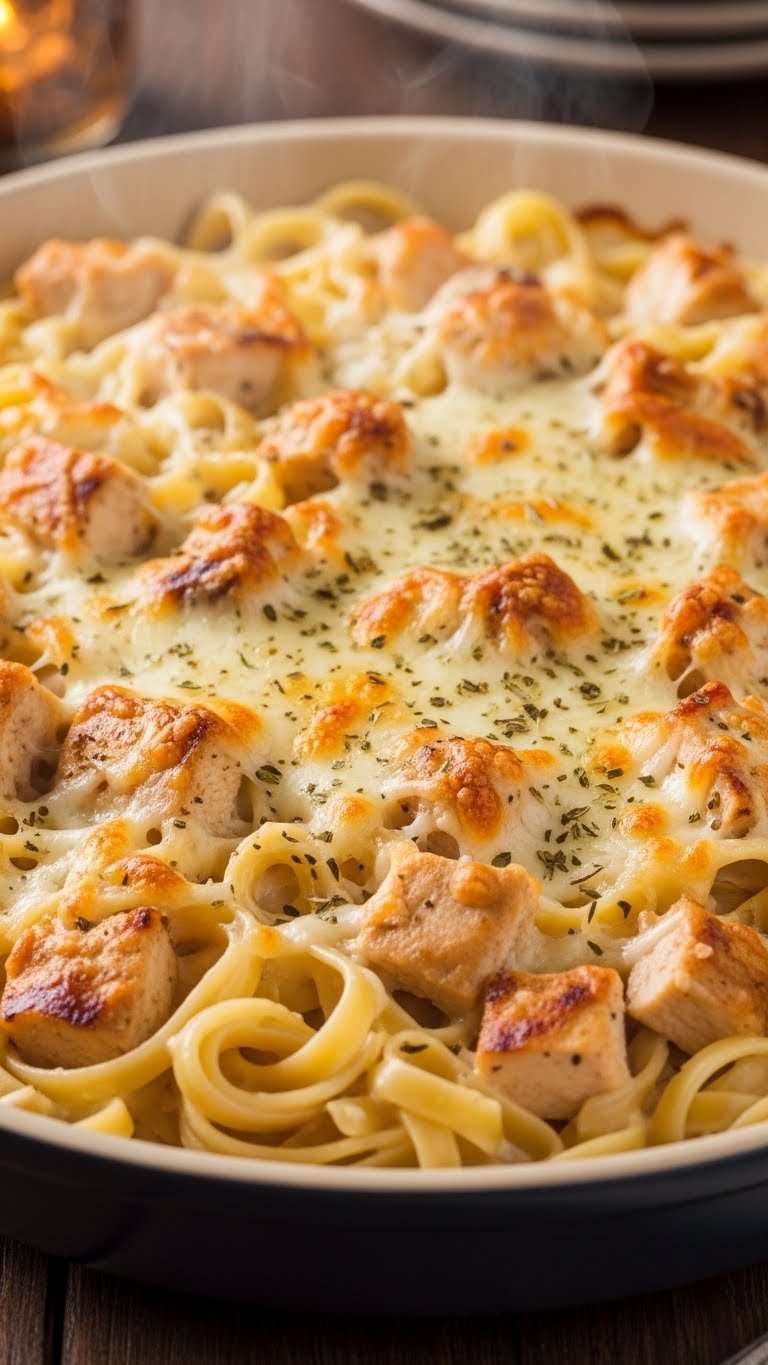 - In a mixing bowl, combine fettuccine, Alfredo sauce, and chicken, then transfer to a greased baking dish.